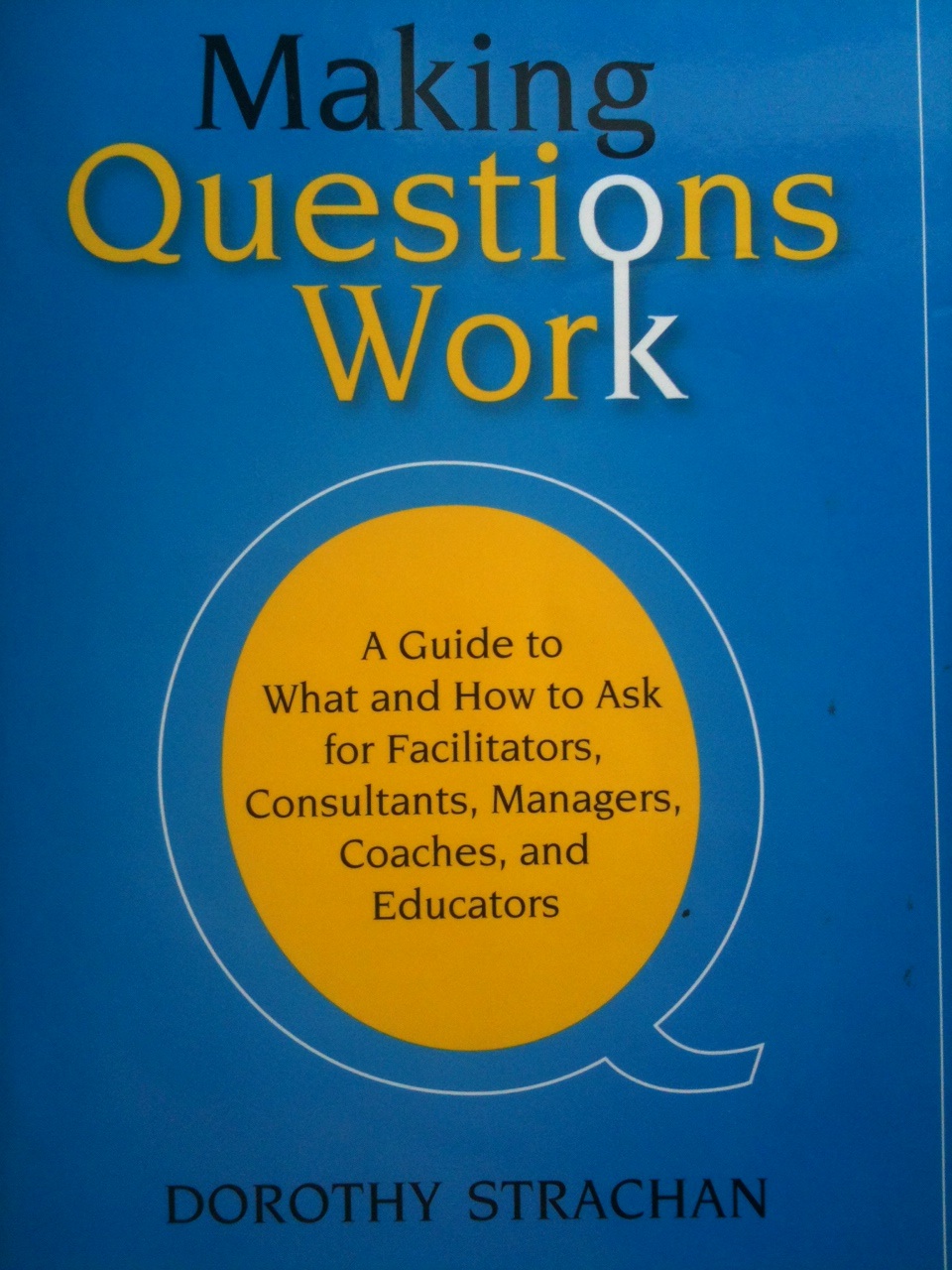 I just finished reading “Making Questions Work: A Guide to What and How to Ask for Facilitators, Consultants, Managers, Coaches and Educators” by Dorothy Strachan. This quote about sums it up: “the right questions for the right people at the right time are at the heart of a healthy group process-a top priority in effective and dynamic facilitation.”