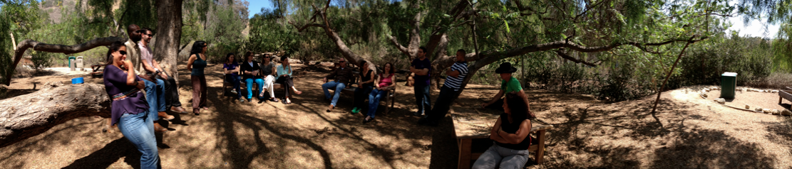 As an alternative, we met as a large group in different spaces within the main room. I also designed several small group sessions in which participants could meet outside. We incorporated a short walk and we ended the retreat in a majestic grove of pepper trees. We started with a U-shaped set of desks. In an intro activity, I asked everyone to pair up and come inside of the U to share their responses. One of the points I made is that within a collaborative change initiative, there are multiple viewpoints. Understanding the perspective of others helps. We literally did this throughout the day and folks shared their positive feedback with me at the end.