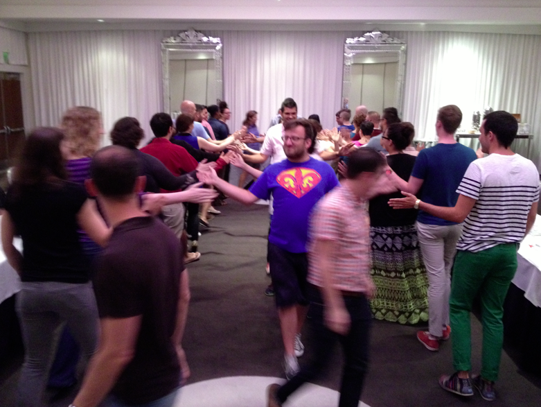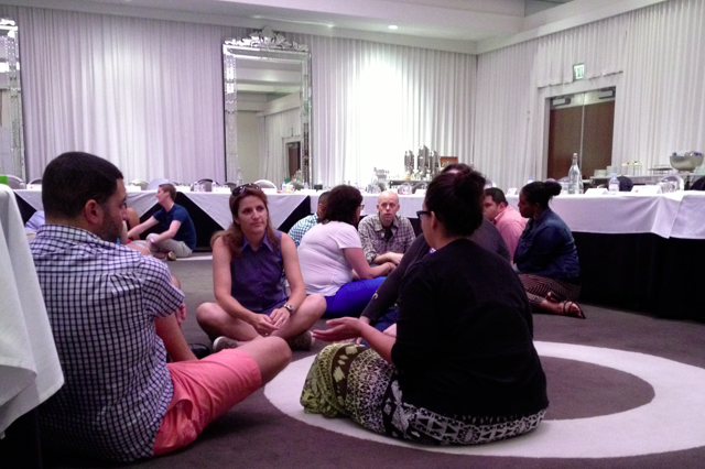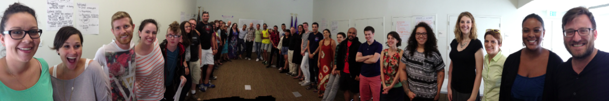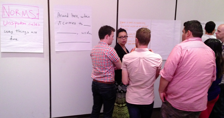 Mapping Structure/Processes: It’s one thing to talk about an organization’s culture in the abstract sitting down around a U-shaped table. A powerful alternative is to use the open space within the U to physically map the organization’s structure and give participants the space to make observations. We did this and then added another illuminating layer that brought their processes to life: I led them in a real word scenario that connected the entire organizational structure together through an exercise in communication. This too served as case study that led to deep insight. Both structure and processes are two key ingredients to an overall organizational design (another good read: Designing Organizations by Jay Galbraith…see the STAR model) and these ultimately generate an organization’s culture. Note that the photo I included here isn’t a picture of the mapping structure/process because I wasn’t able to take a picture of it while it was happening. This photo is from a fun, spontaneous relationship building exercise I led on day one). For other process suggestions, see my post I wrote listing 15 options.